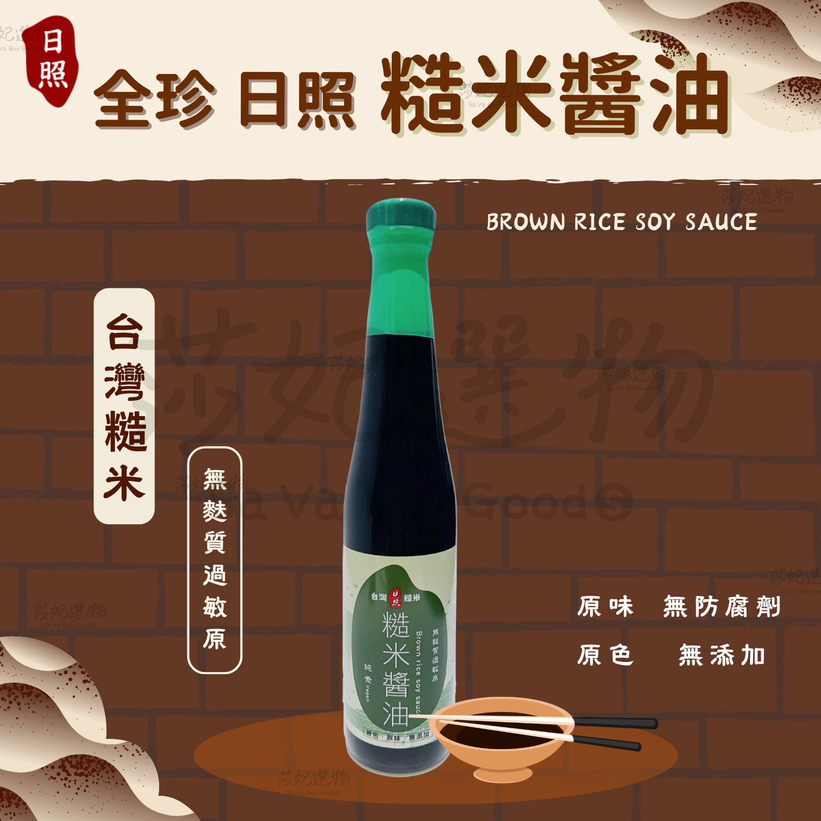 使用南投草屯在地糙米釀造,除了鹽、水之外無任何添加物,葷素皆宜,健康美味、芳香。